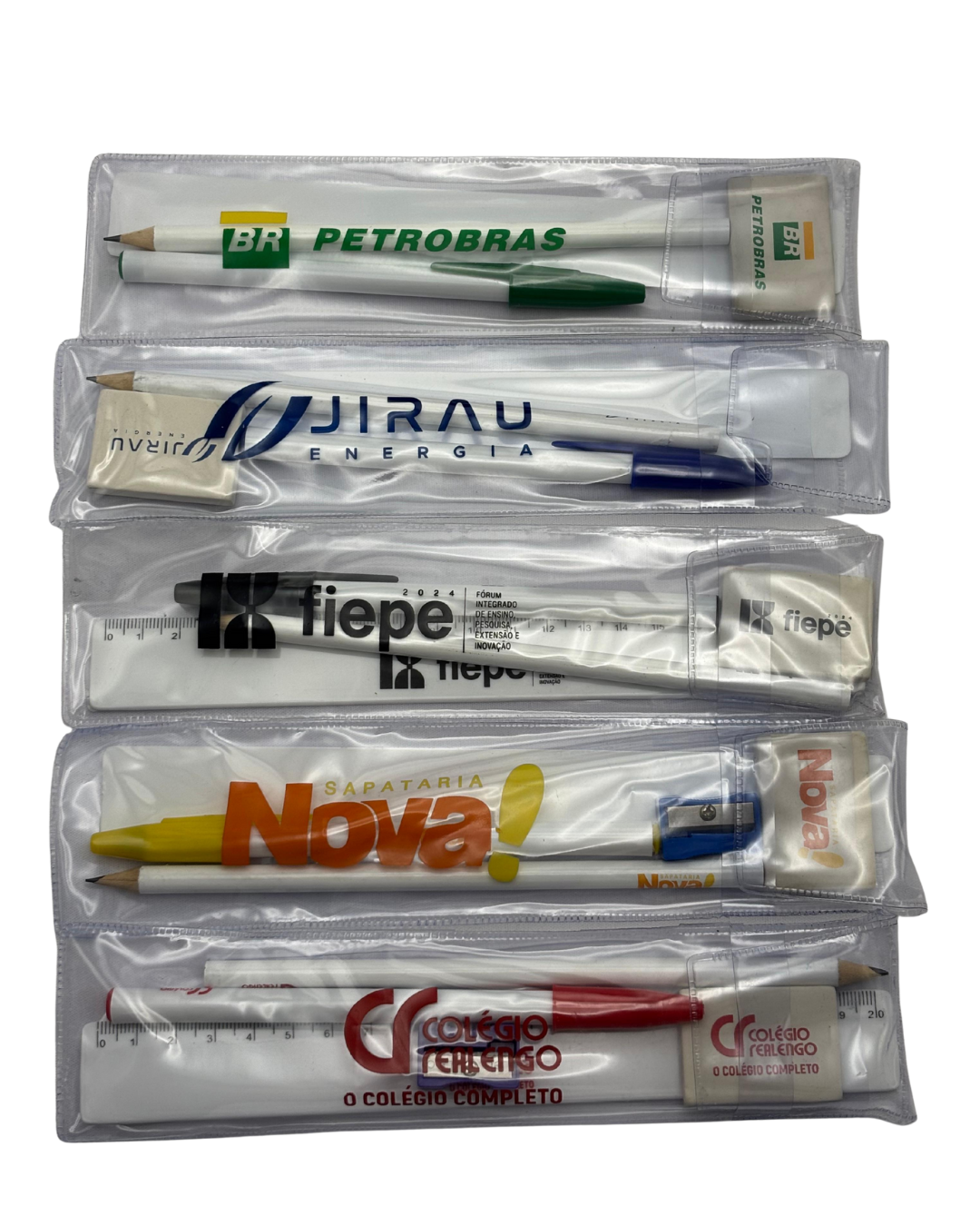 Estojo PVC reforçado, perfeito para kits escolares e corporativos.